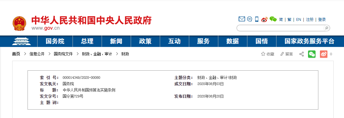 現(xiàn)公布修訂后的《中華人民共和國預(yù)算法實施條例》,自2020年10月1日起施行。